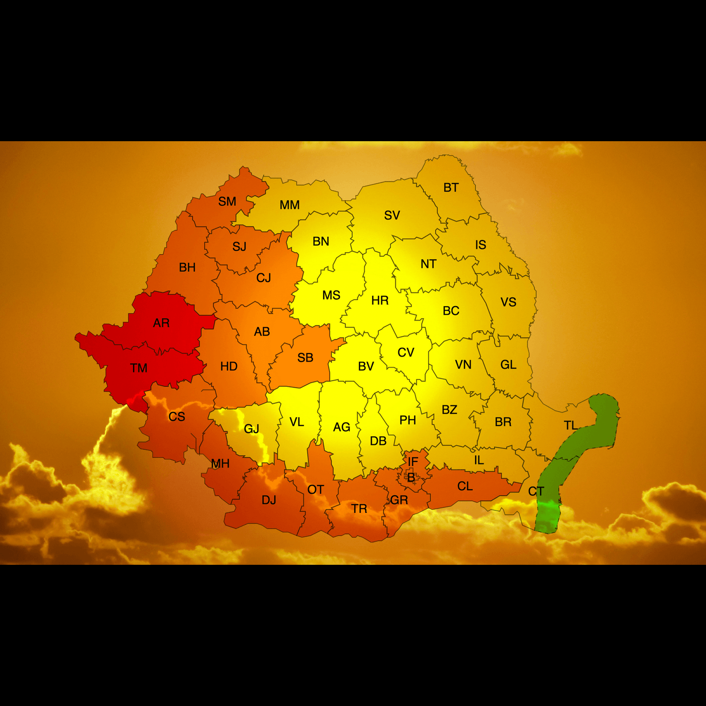 - Cod Roșu: În județele Timiș și Arad, temperaturile maxime vor atinge între 38 și 39 de grade Celsius, iar indicele temperatură-umezeală (ITU) va depăși pragul critic de 80 de unități. Nopțile tropicale, cu minime între 19 și 25 de grade Celsius, vor agrava disconfortul termic, menținând condiții de căldură extremă chiar și pe timpul nopții.