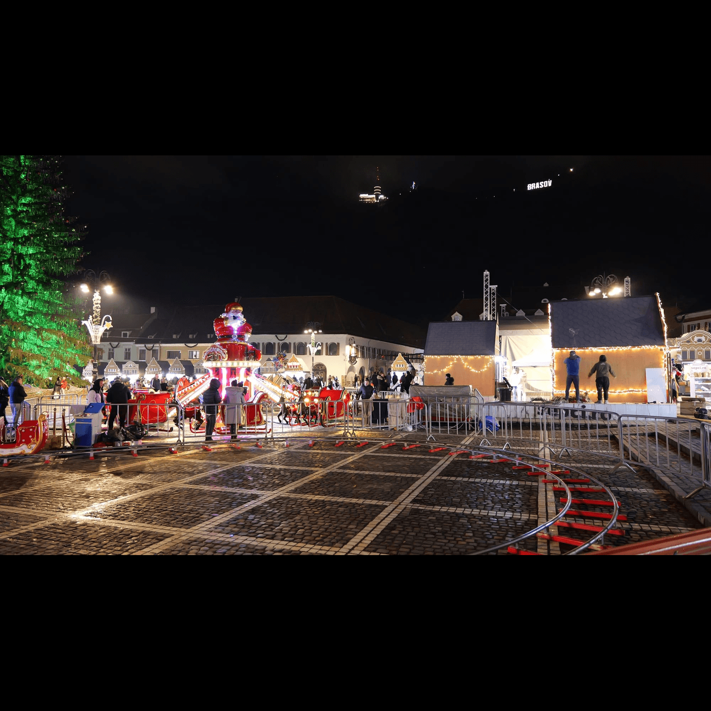 În Piața Sfatului, spațiul care găzduiește în fiecare decembrie Târgul de Crăciun începe să capete forma familiară, iar seara tot mai mulți turiști aleg să se plimbe prin centrul vechi, atrași de atmosfera care se conturează de la o zi la alta.