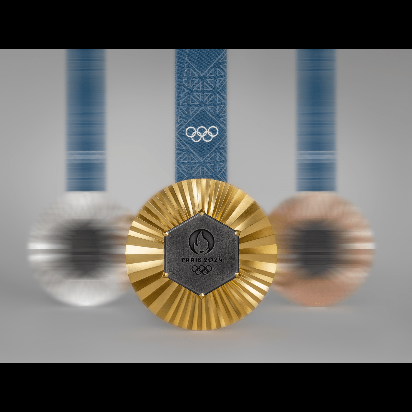 Hexagonul central al medaliei, reprezentând Franța, încorporează fierul de la Turnul Eiffel și este gravat cu emblema Jocurilor de la Paris 2024. Această emblemă include medalia de aur, flacăra olimpică și chipul Mariannei, simbolizând Republica Franceză.
