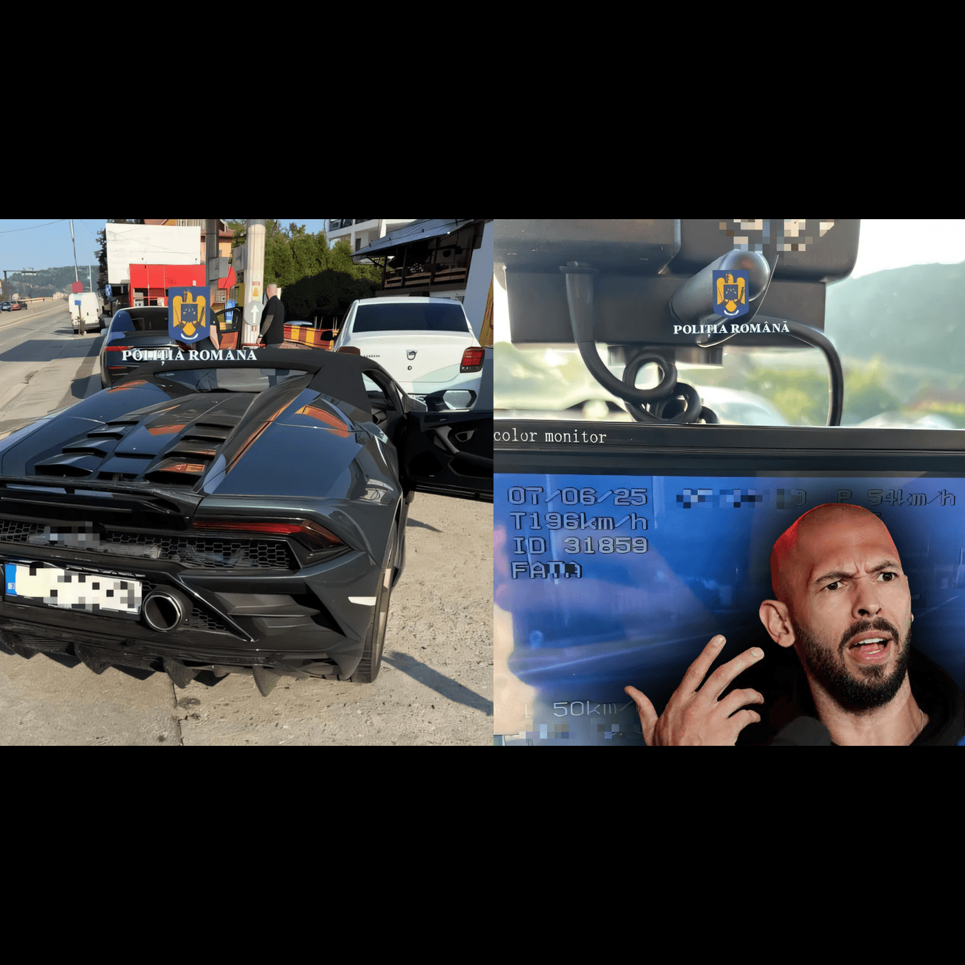 Pe 7 iunie, Andrew Tate a fost oprit de polițiștii din județul Vâlcea în cadrul unei acțiuni de prevenire a accidentelor rutiere cauzate de viteză excesivă. Aparatul radar a înregistrat viteza de 196 km/h, cu 146 km/h peste limita legală admisă pe acel sector de drum. În consecință, Tate a fost sancționat cu o amendă de 1.822 de lei și i s-a suspendat permisul pentru 120 de zile.