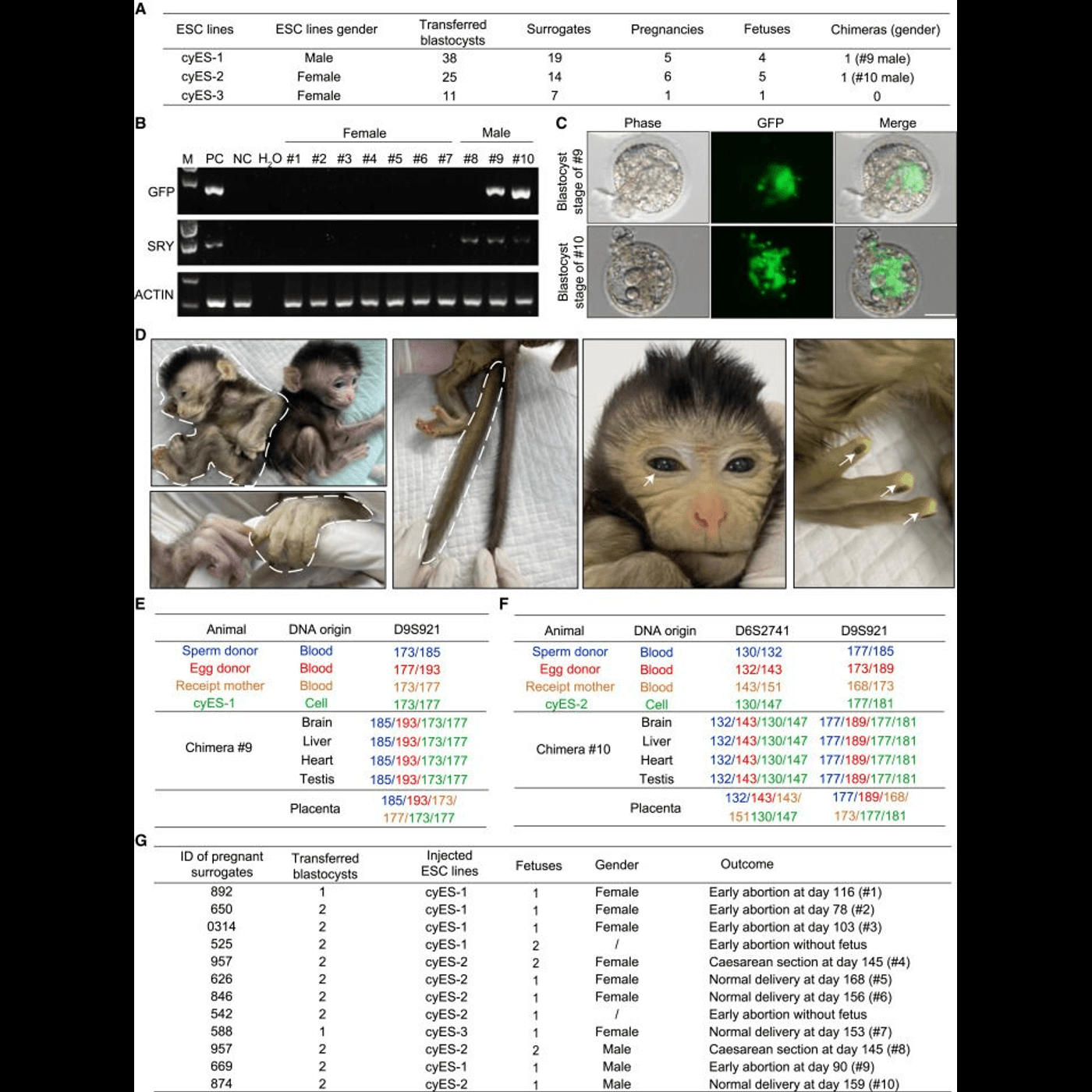 Ulterior, cercetătorii au selectat un subset de celule pentru a le injecta în embrioni distinct genetic, cu vârste cuprinse între 4 și 5 zile. Aceste celule au fost, de asemenea, tratate cu o proteină fluorescentă verde, facilitând monitorizarea dezvoltării lor în organismul gazdă. Embrionii au fost apoi implantați în maimuțe femele, rezultând 12 sarcini și șase nașteri vii.