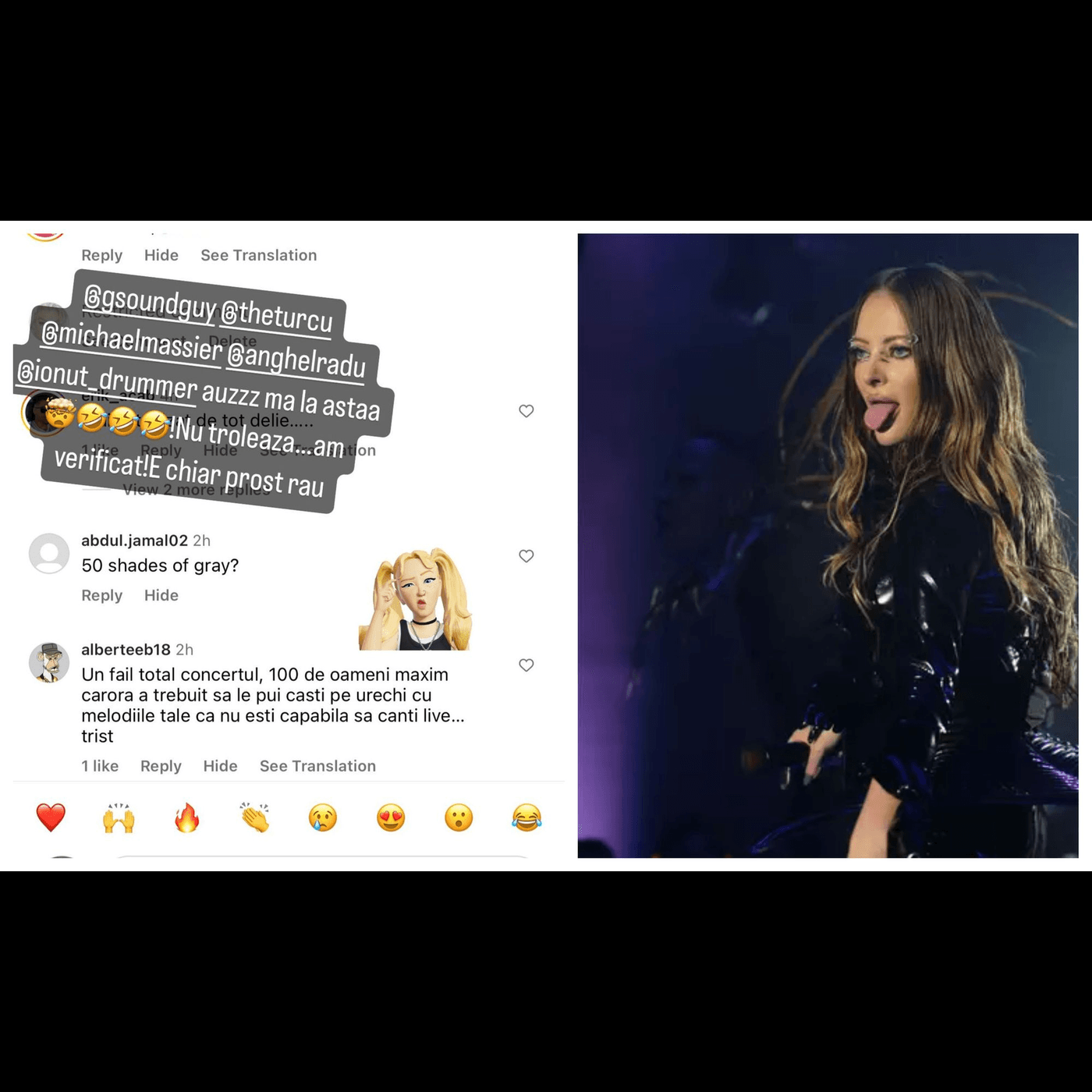 „Un fail total concertul. 100 de oameni maxim, cărora a trebuit să le pui căști pe urechi cu melodiile tale pentru că nu ești capabilă să cânți live. Trist.”, este comentariul care a scos-o din sărite pe Delia.