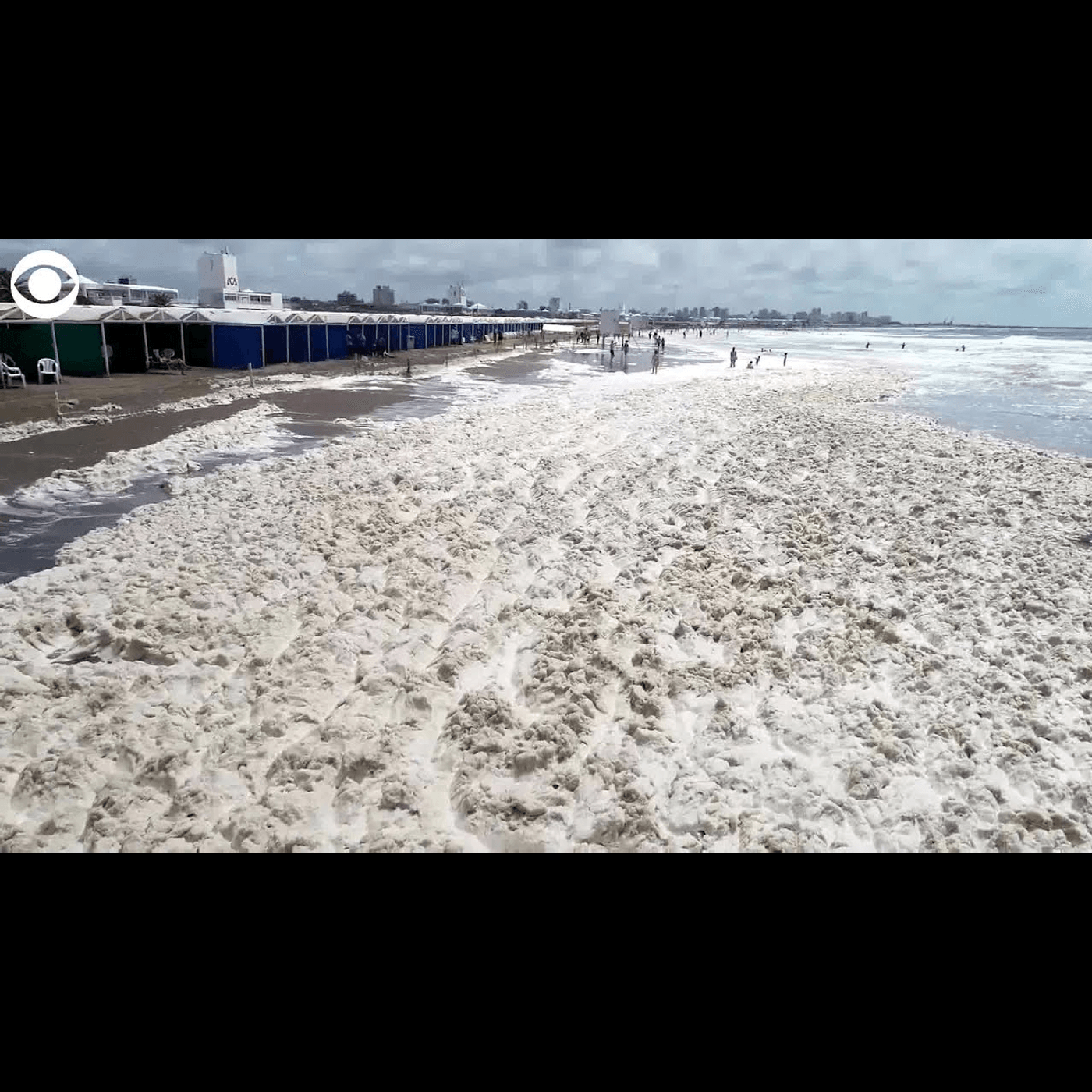 Oamenii aflați pe plajă au făcut baie în spuma mării și și-au acoperit trupurile cu spuma groasă ca o pătură de mare.