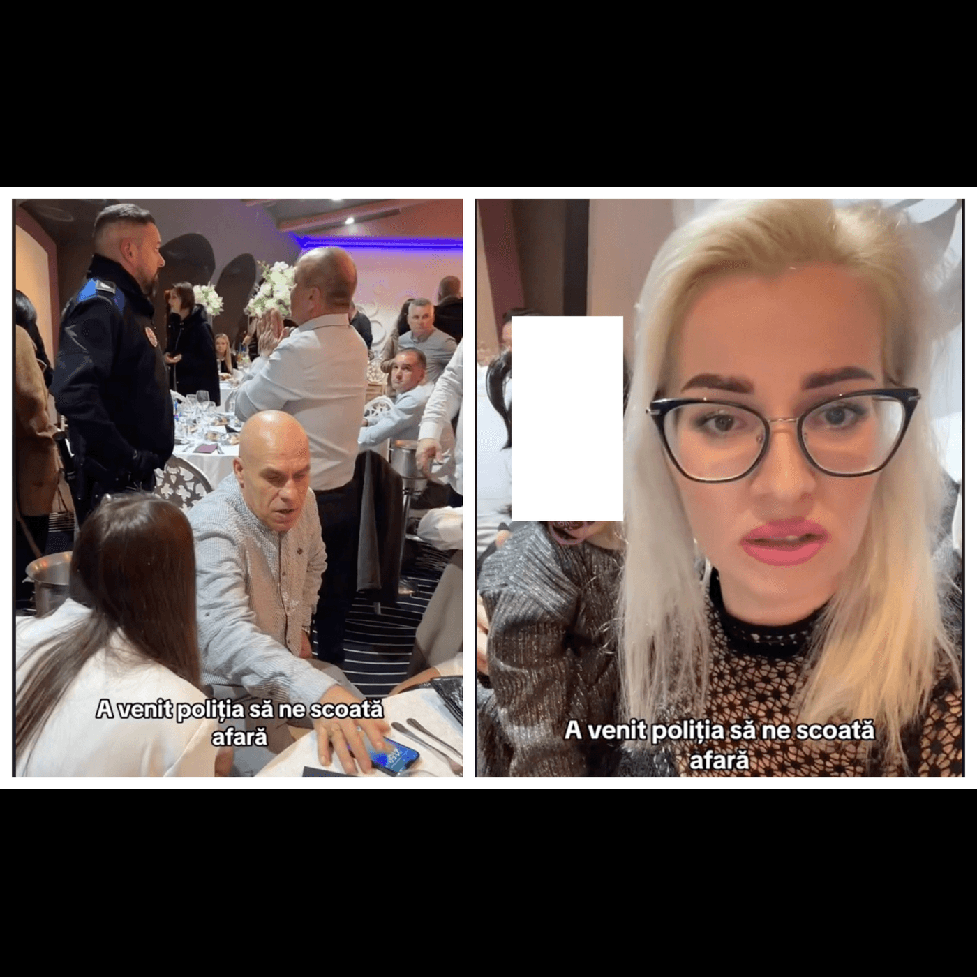 „Sperăm că Revelionul să nu se termine urât. A venit Poliția, nu știu pe cine caută. Deja ne-au spus să părăsim localul. Uite-l acolo, încearcă să ne explice. Fix asta ne mai trebuia. Facem în mașină Revelionul? Am plătit bine, ce să mai zic... Nici n-am mâncat. Doamne! Așa ghinion? De asta nici nu a venit mâncarea.”, spune femeia la începutul filmulețului.