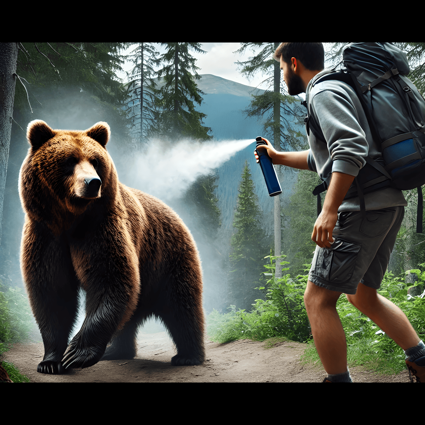 - Distanța de pulverizare: Spray-ul trebuie utilizat de la o distanță suficient de mare (ideal între 5 și 9 metri) pentru a permite formarea unui nor dens înainte ca ursul să ajungă prea aproape.