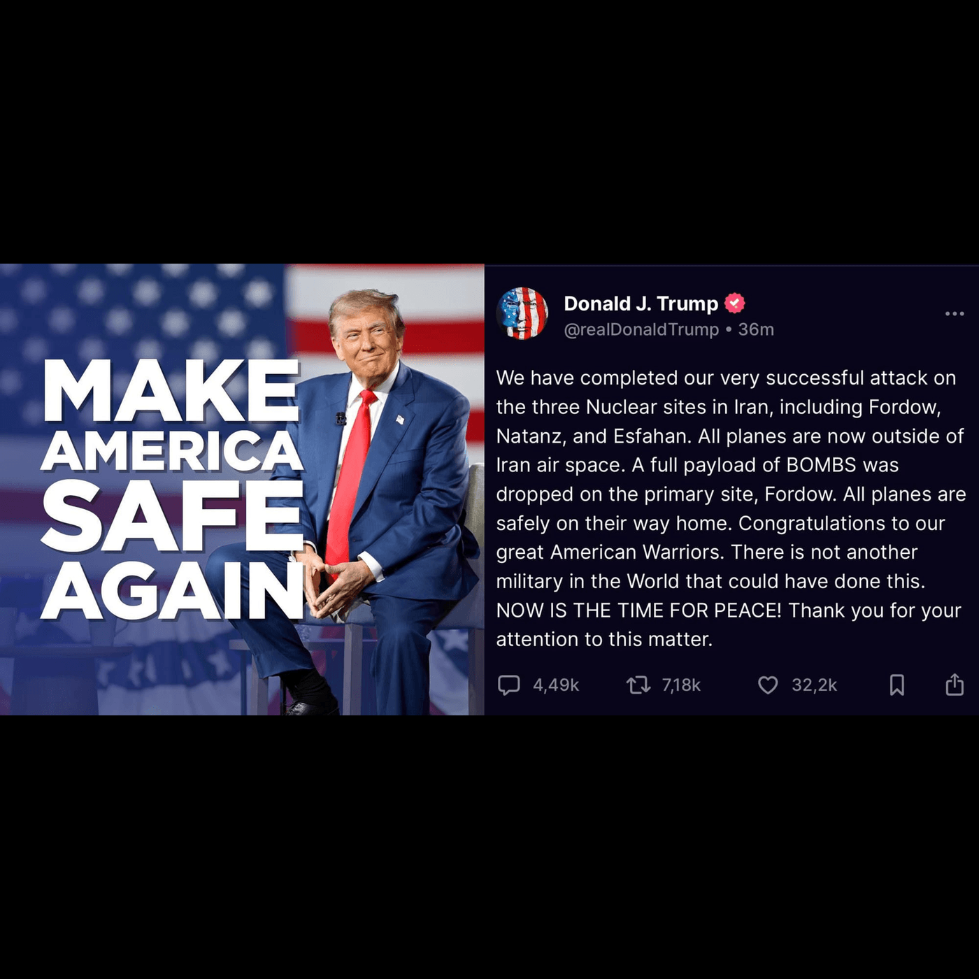 „Am finalizat cu succes atacul asupra celor trei situri nucleare din Iran, inclusiv Fordow, Natanz și Esfahan. Toate avioanele se află acum în afara spațiului aerian iranian. O încărcătură completă de BOMBE a fost aruncată asupra sitului principal, Fordow. Toate avioanele se îndreaptă în siguranță spre casă. Felicitări marilor noștri războinici americani. Nicio altă armată din lume nu ar fi putut realiza acest lucru. ACUM ESTE MOMENTUL PĂCII! Vă mulțumesc pentru atenția acordată acestei chestiuni.”, a scris Trump într-o postare pe Truth Social.