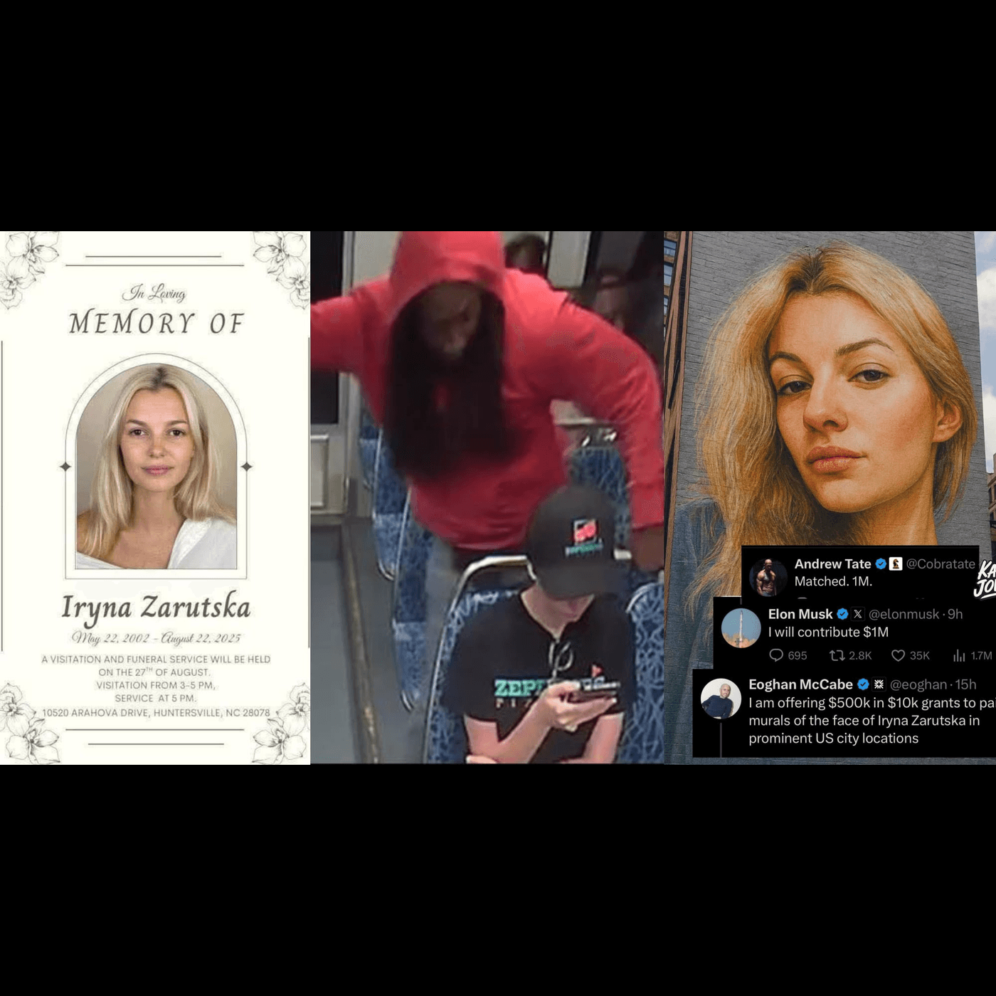Elon Musk a donat 1 milion de dolari pentru un fond dedicat Irinei Zarutska, iar Andrew Tate a anunțat că va contribui cu aceeași sumă.